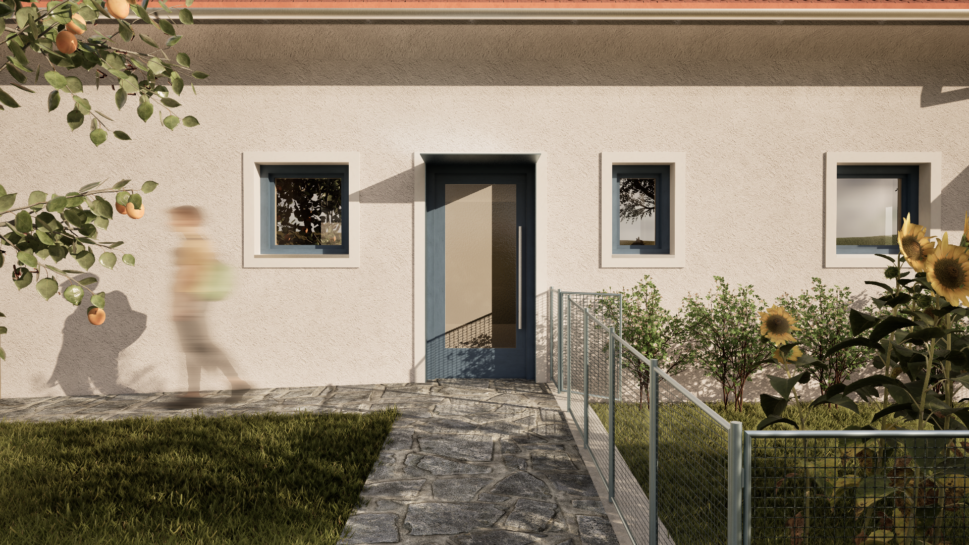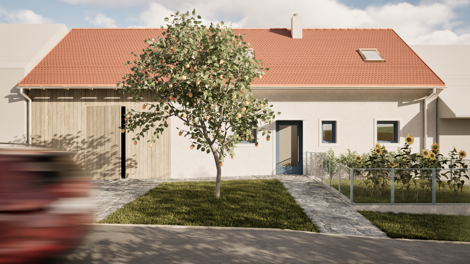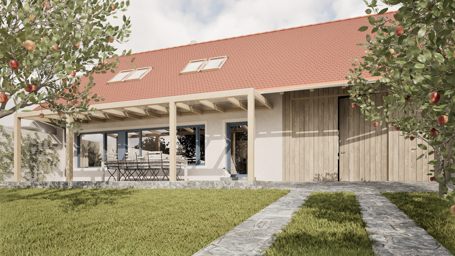 Materiálové řešení pracuje s tradičními prvky – bílou vápennou omítkou, pálenou střešní krytinou a tlumenými odstíny výplní otvorů. Výsledkem je současný dům s přirozeným venkovským charakterem.