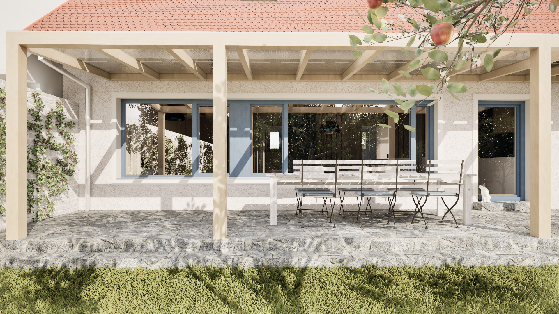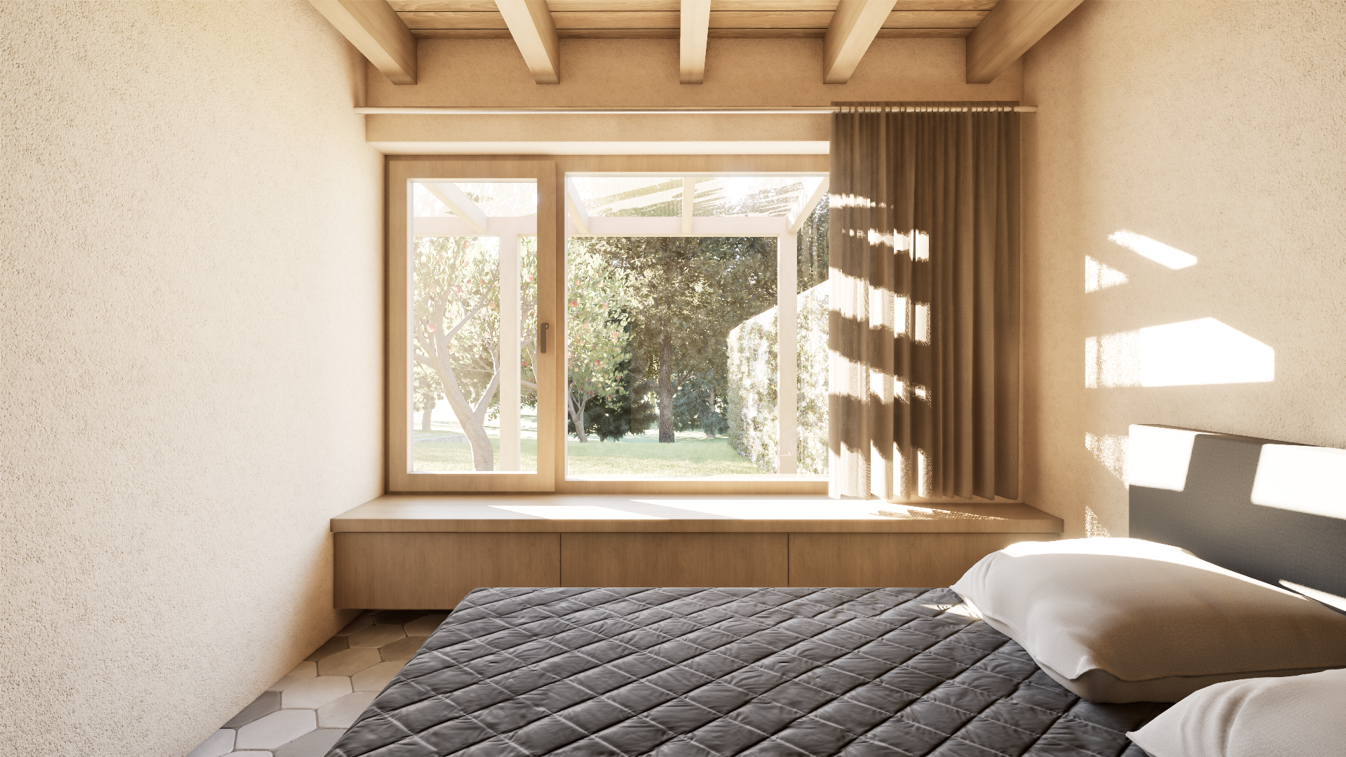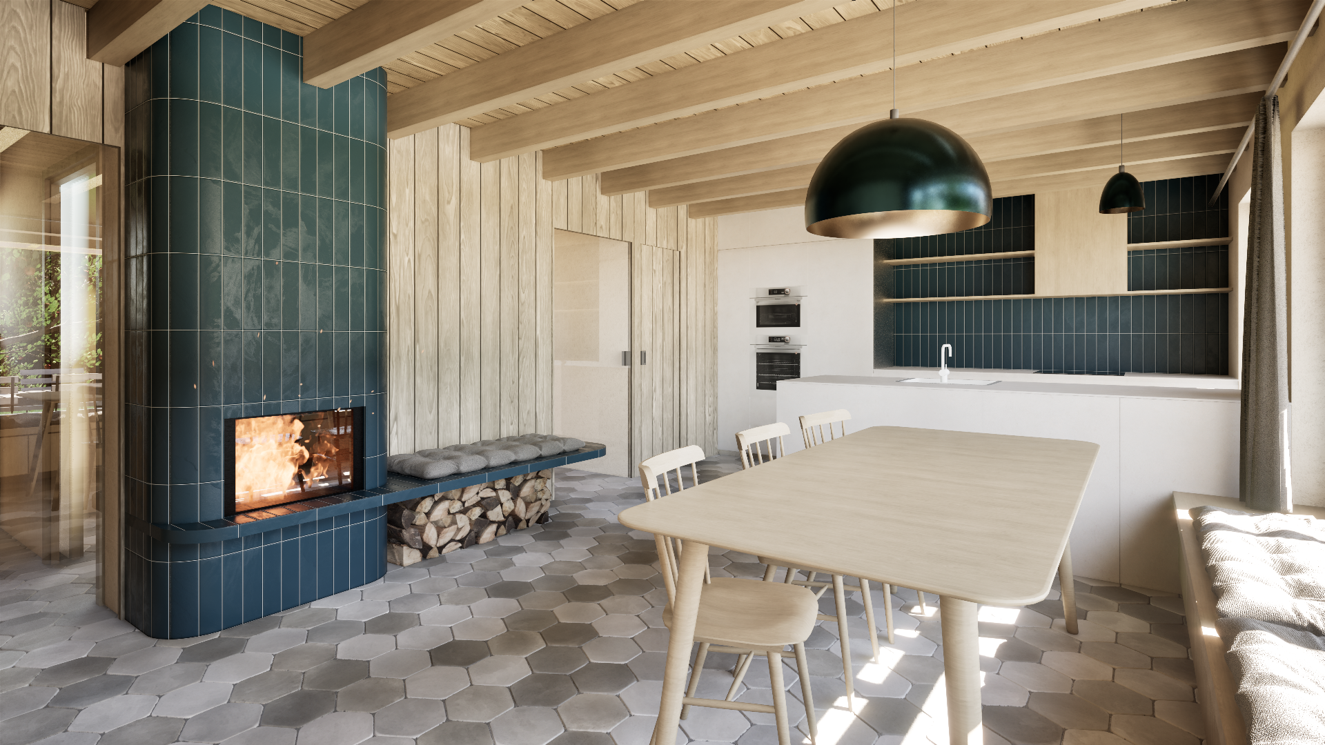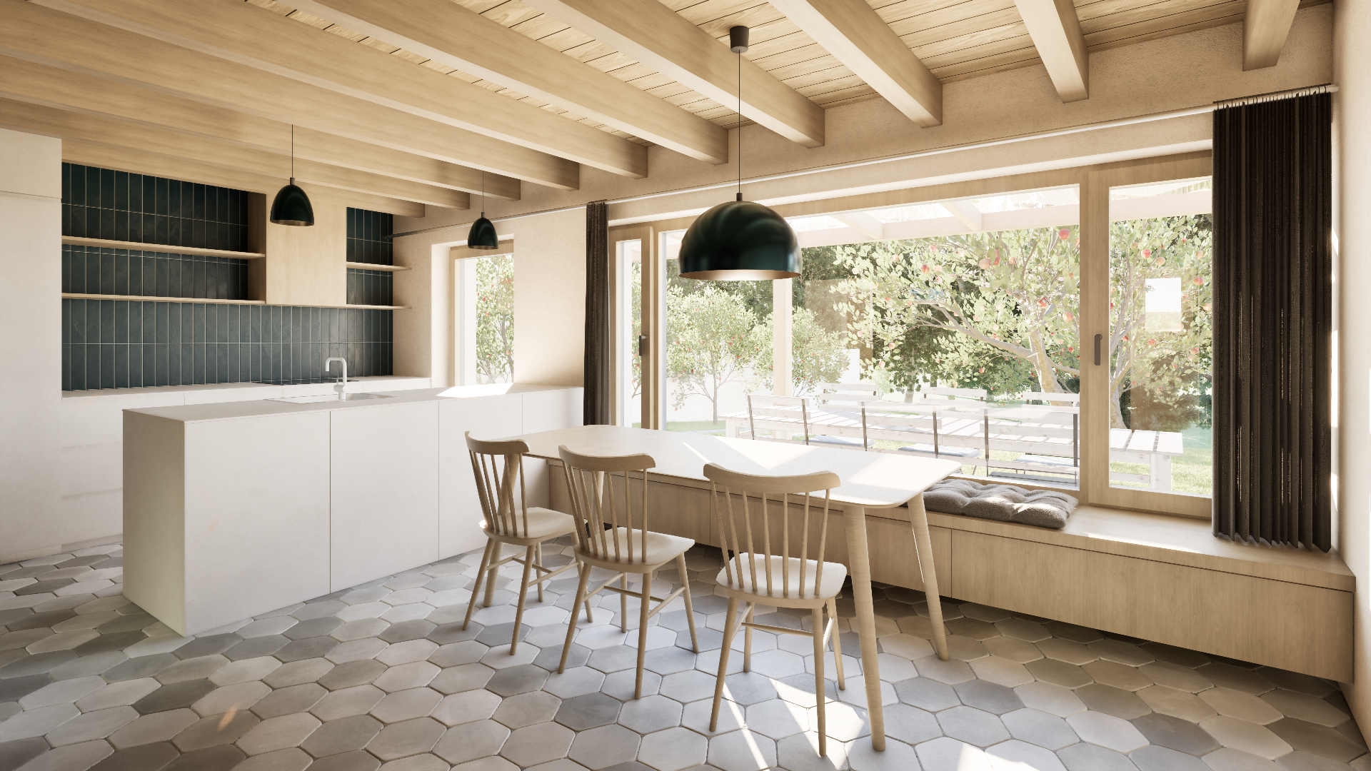 Materiálové řešení pracuje s tradičními prvky – bílou vápennou omítkou, pálenou střešní krytinou a tlumenými odstíny výplní otvorů. Výsledkem je současný dům s přirozeným venkovským charakterem.