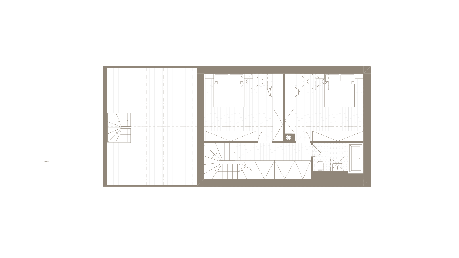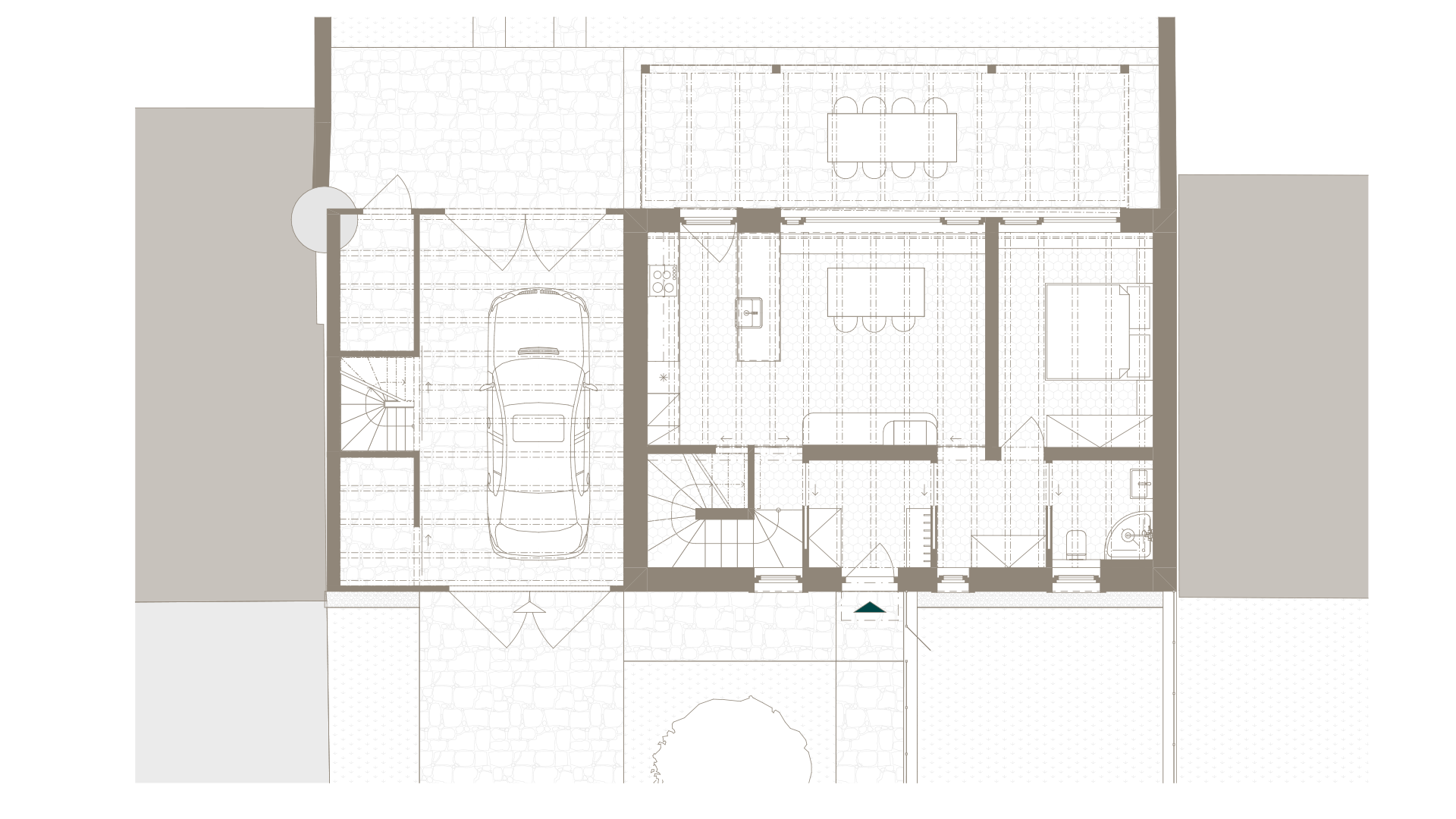 Dům je navržen jako rekreační zázemí mladé rodiny s možností budoucího trvalého bydlení. Hlavní obytný prostor s kuchyní a jídelnou je orientován do zahrady a volně navazuje na soukromý venkovní prostor. Charakteristickým prvkem návrhu je průjezd inspirovaný tradiční stodolou, který propojuje ulici se dvorem a zároveň slouží jako kryté parkování a zázemí pro práci i skladování.